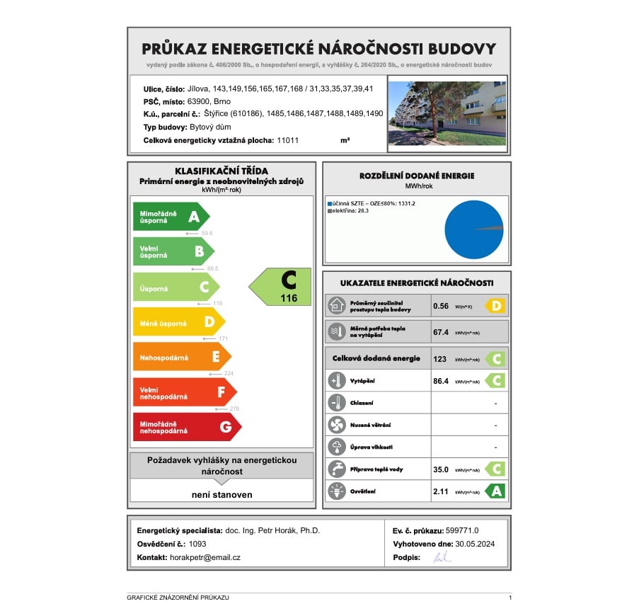 Dům, ve kterém se byt nachází, je po kompletní revitalizaci a je zateplený. Budova je dle Energetického štítku domu - C - úsporná.